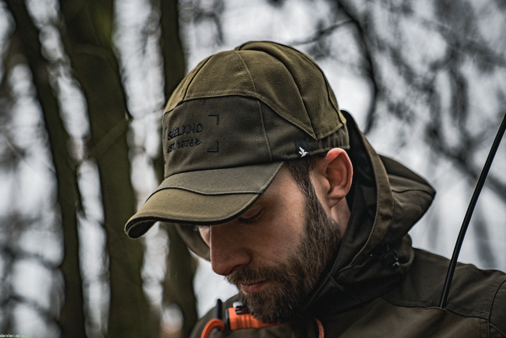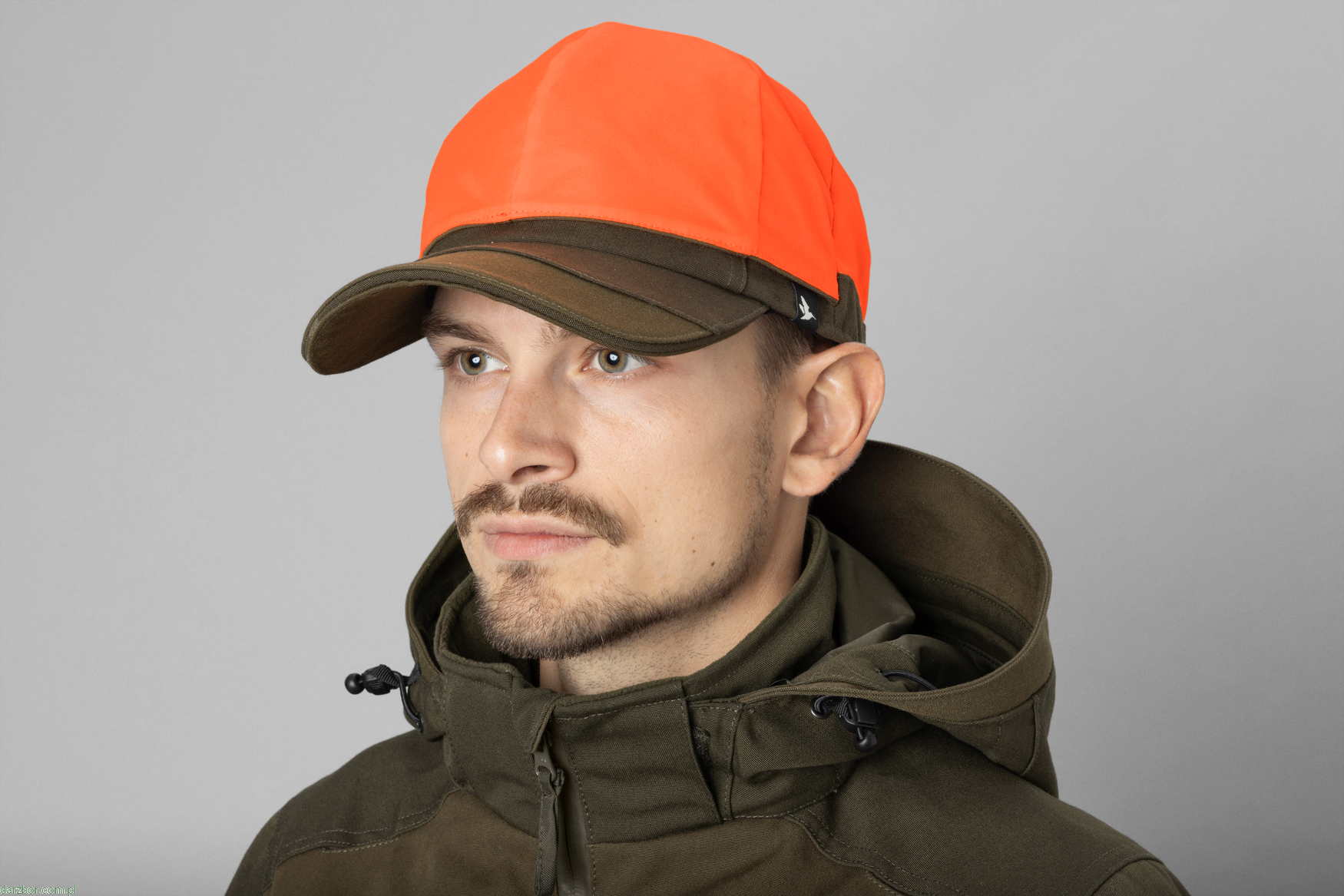 Czapka ma odwracalną, pomarańczową stronę dla wysokiej widoczności podczas polowań z nagonką i gruby, solidny daszek.