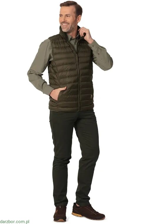 Kamizelka zapinana jest na wytrzymały zamek marki YKK. Wewnętrzna strona kołnierza obszyta została miłą w dotyku tkaniną zamszową, która zapobiega nieestetycznym przetarciom. Elastyczna lamówka u dołu optymalnie dopasowuje i opina pas, chroniąc jednocześnie przed utratą ciepła. Wyjątkowa lekkość i ponadczasowy, pikowany krój gwarantują uniwersalność zastosowania kamizelki. Idealnie sprawdzi się jako warstwa docieplająca pod kurtkę lub jako bezrękawnik. Wyjątkowa sprężystość zastosowanego puchu sprawia, że kamizelka po złożeniu zajmuje bardzo mało miejsca. Z łatwością można ją wrzucić do plecaka, czy też torebki i bez problemu przetransportować z miejsca na miejsce. Do każdej sztuki dołączony jest odpowiedniej wielkości nylonowy woreczek ze ściągaczem, do którego wnętrza można ją złożyć.