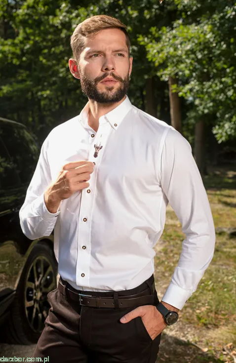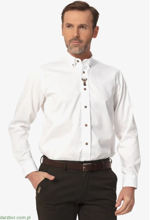Koszula męska Koziołek to oryginalna odsłona białej koszuli. Elegancki materiał z wyhaftowaną na plisie głową koziołka nawiązuje do motywów zwierzęcych. Koszulę odróżniają także guziki imitujące wygląd poroża.