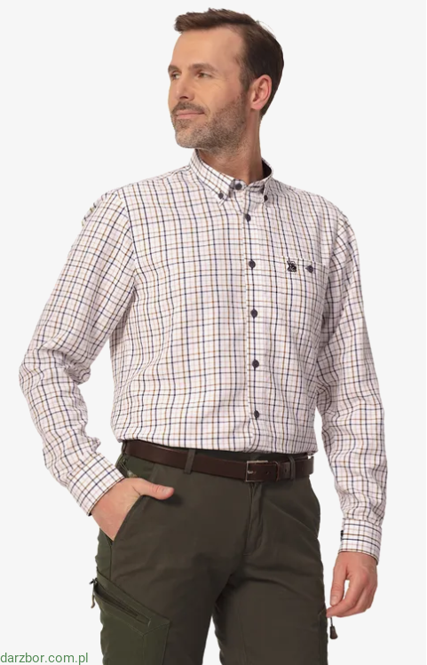 Koszula męska Stam to elegancka koszula w delikatną granatowo-beżowo-brązową kratkę na białym tle. Zawartość modalu w składzie nadaje koszuli praktycznych cech. To doskonała propozycja na każdą elegancką okazję, oficjalne spotkanie, bądź wyjście do pracy.