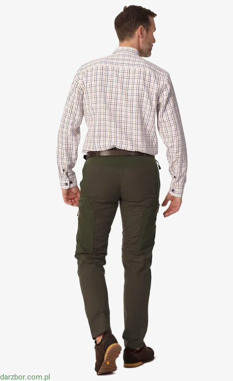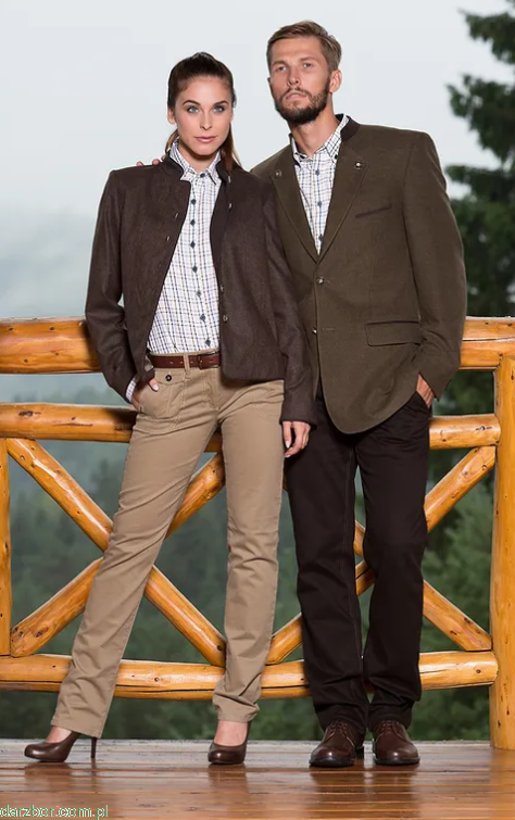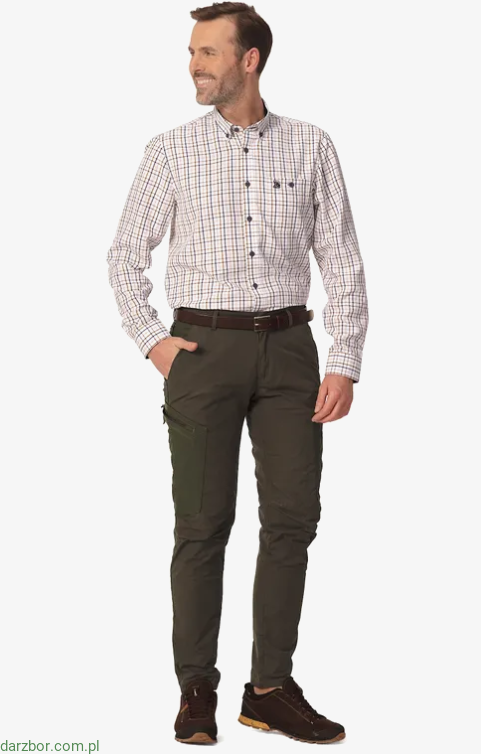 Kołnierzyk i wewnętrzna strona mankietów koszuli z długim rękawem zostały obszyte kontrastową czarną tkaniną. Na lewej piersi znajduje się zapinana na guzik kieszeń z wyhaftowanym logotypem marki. Kołnierzyk jest podpięty guzikami. Mankiety również są zapinane na guziki.