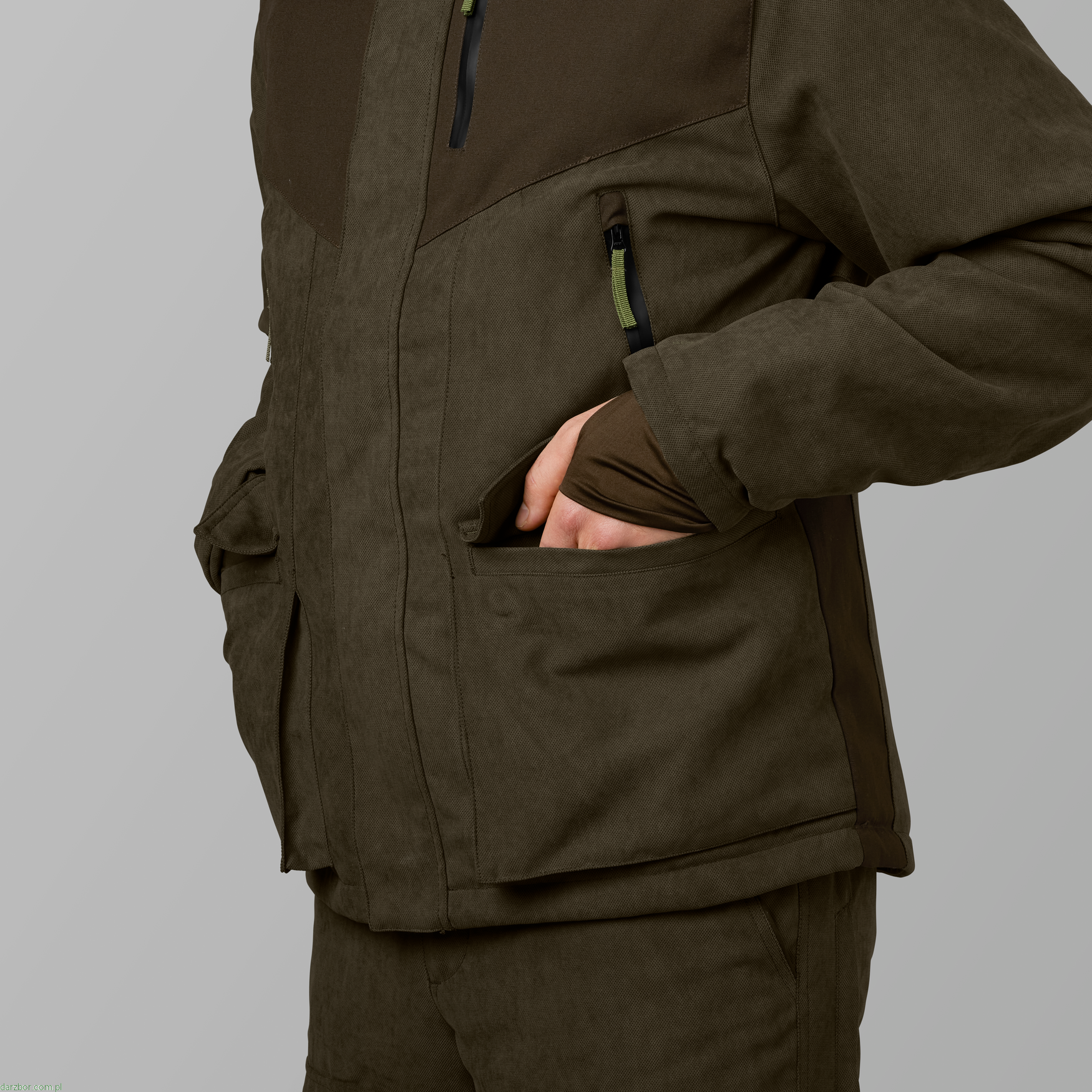 Na lewej piersi znajduje się zapinana na zamek kieszeń na radio z oczkiem na antenę oraz kieszenie do ogrzania dłoni wyłożone miękkim, ciepłym polarem, które również są zapinane na zamek. Dwie bardzo duże kieszenie z przodu zapinane na cichy magnes oraz duża kieszeń z tyłu zapinana na zamek.