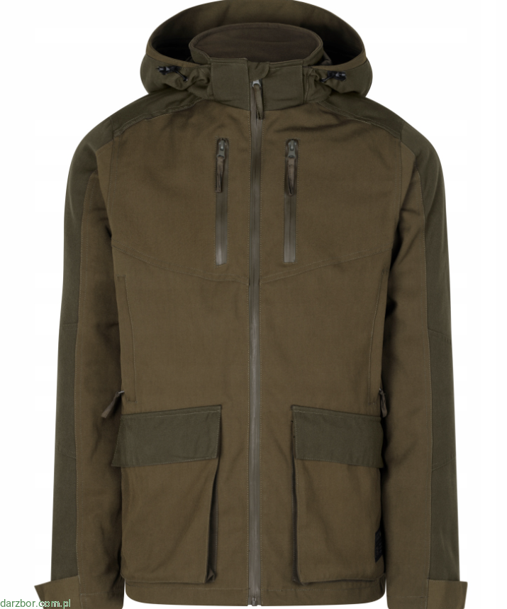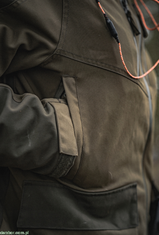 Kurtka ma odpinany kaptur na suwak, obszerne kieszenie z wodoodpornymi zamkami błyskawicznymi i kieszeń na zwierzynę łowną, dostosowaną do polowań pędzonych.