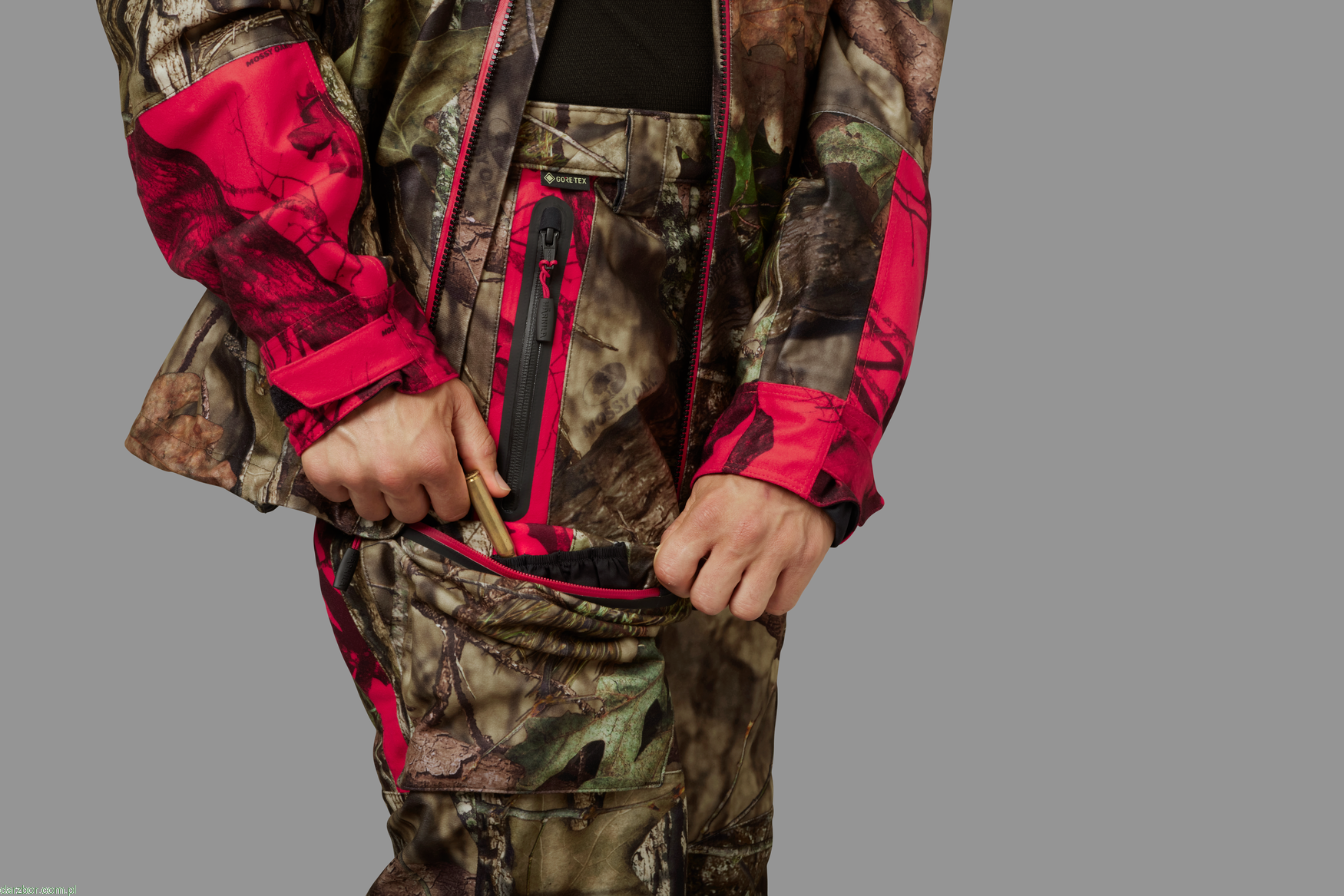 Spodnie Moose Hunter 2.0 GTX mają zarówno przednie kieszenie, jak i kieszenie na udach, wszystkie z wodoodpornymi zamkami błyskawicznymi oraz zamki wentylacyjne z ochronnymi klapami sztormowymi z tyłu ud. W prawej kieszeni na udzie znajduje się uchwyt na naboje.