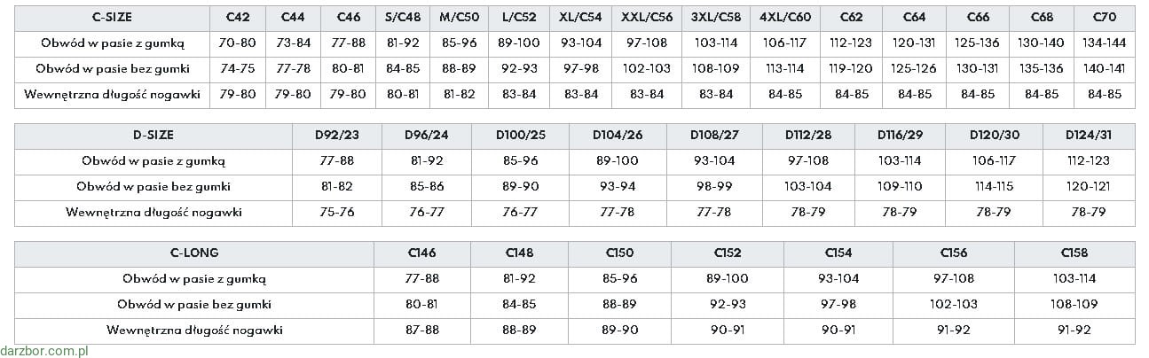 | Wewnętrzna długość nogawki | 87-88 | 88-89 | 89-90 | 90-91 | 90-91 | 91-92 | 91-92 |